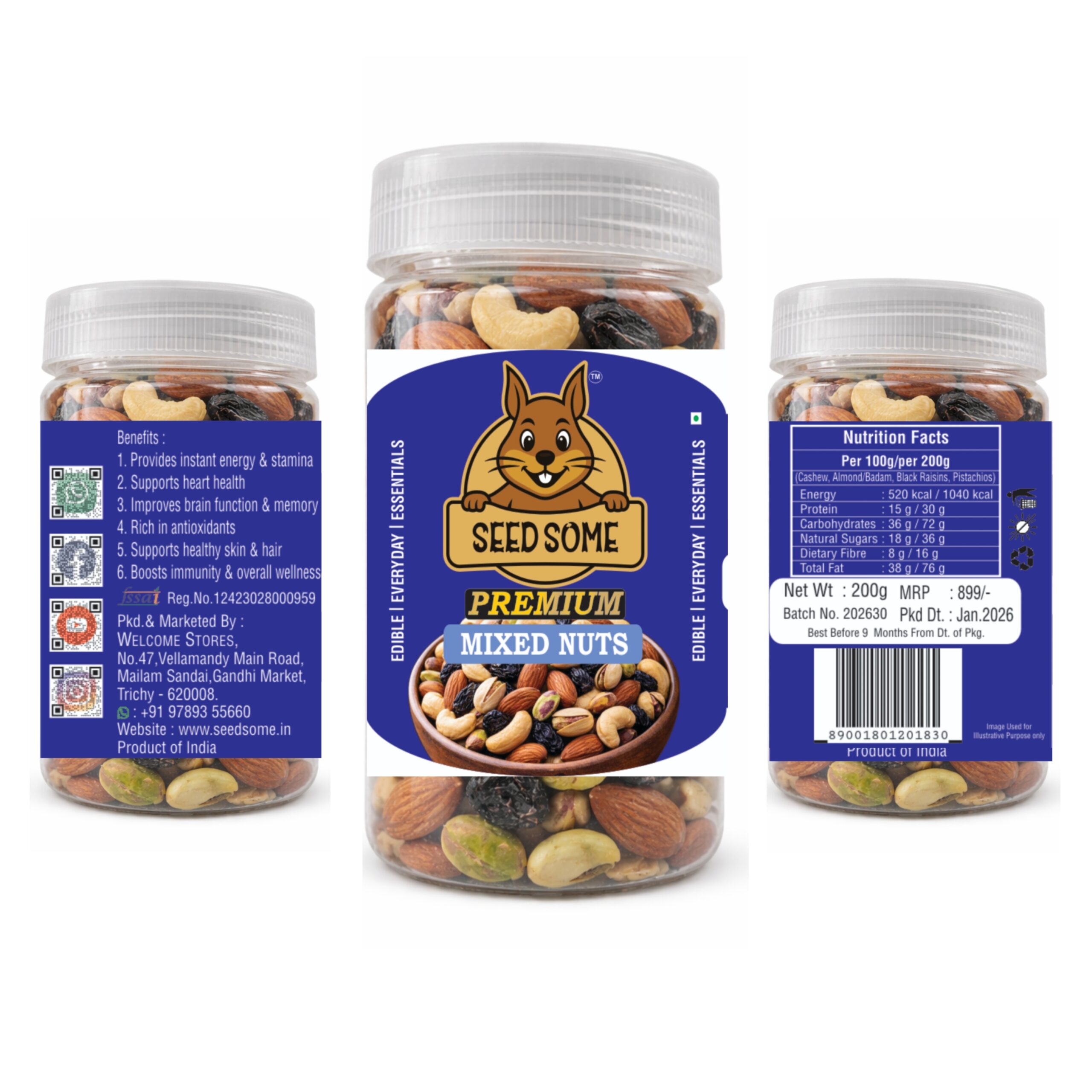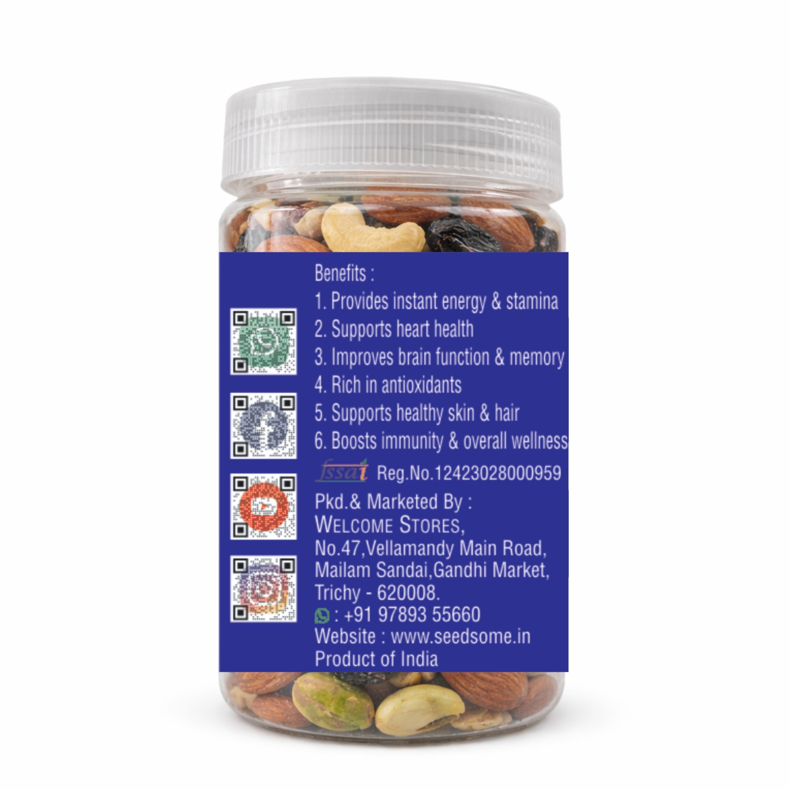Enjoy a wholesome blend of premium dry fruits with our Mixed Seeds 200g pack, carefully curated to deliver taste, nutrition, and quality in every bite. This nutritious mix includes crunchy cashews, protein-rich almonds, naturally sweet black raisins, and flavorful pistachios, making it a perfect snack for all age groups. Packed with essential vitamins, minerals, healthy fats, and antioxidants, this dry fruit mix supports heart health, boosts energy, and promotes overall wellness. Ideal for daily snacking, breakfast toppings, baking, gifting, or festive use, these mixed seeds are hygienically packed to retain freshness and natural goodness. Free from artificial colors, preservatives, and added sugar, this premium mixed dry fruit combo is perfect for a healthy lifestyle. Add this healthy mixed nuts pack to your diet for a delicious and nourishing experience every day. Perfect choice for fitness lovers, working professionals, and families seeking nutritious snacks.