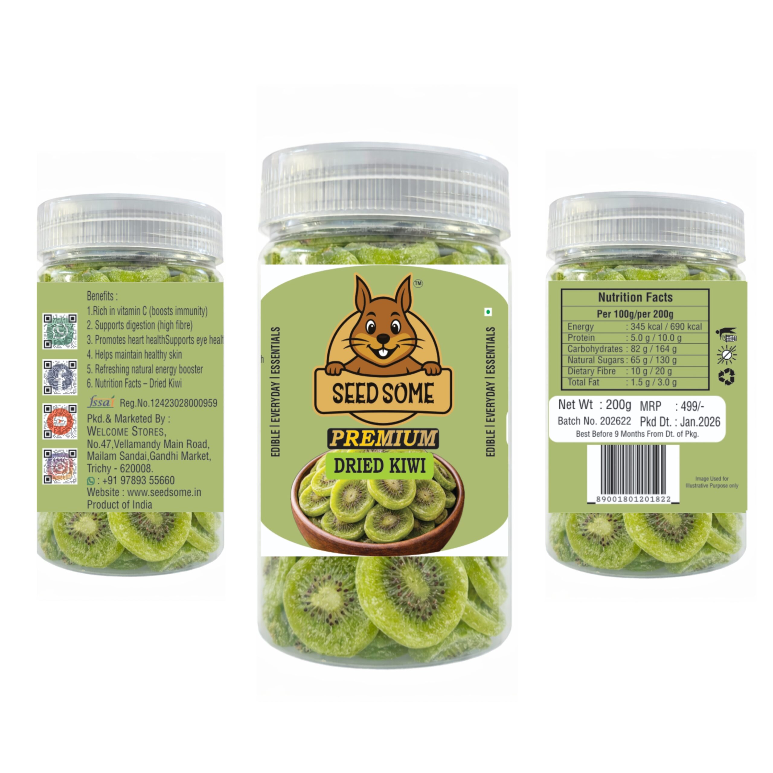 Enjoy the refreshing taste and natural nutrition of Seedsome Dried Kiwi 200g, made from carefully selected premium-quality kiwi fruits and gently dried to retain flavor and nutrients. These vibrant green kiwi slices are rich in vitamin C, dietary fiber, antioxidants, and essential minerals that help support immunity, digestion, and overall wellness. With a perfect balance of sweet and tangy flavor, dried kiwi makes a delicious and healthy snack for all ages. Ideal for adding to cereals, smoothies, yogurt, salads, desserts, baking, and trail mixes, Seedsome Dried Kiwi enhances both taste and nutrition. Hygienically packed to maintain freshness and quality, it contains no artificial colors, preservatives, or harmful additives. Perfect for fitness enthusiasts, kids, and health-conscious individuals, Seedsome Dried Kiwi offers a convenient and tasty way to enjoy superfruit benefits every day.