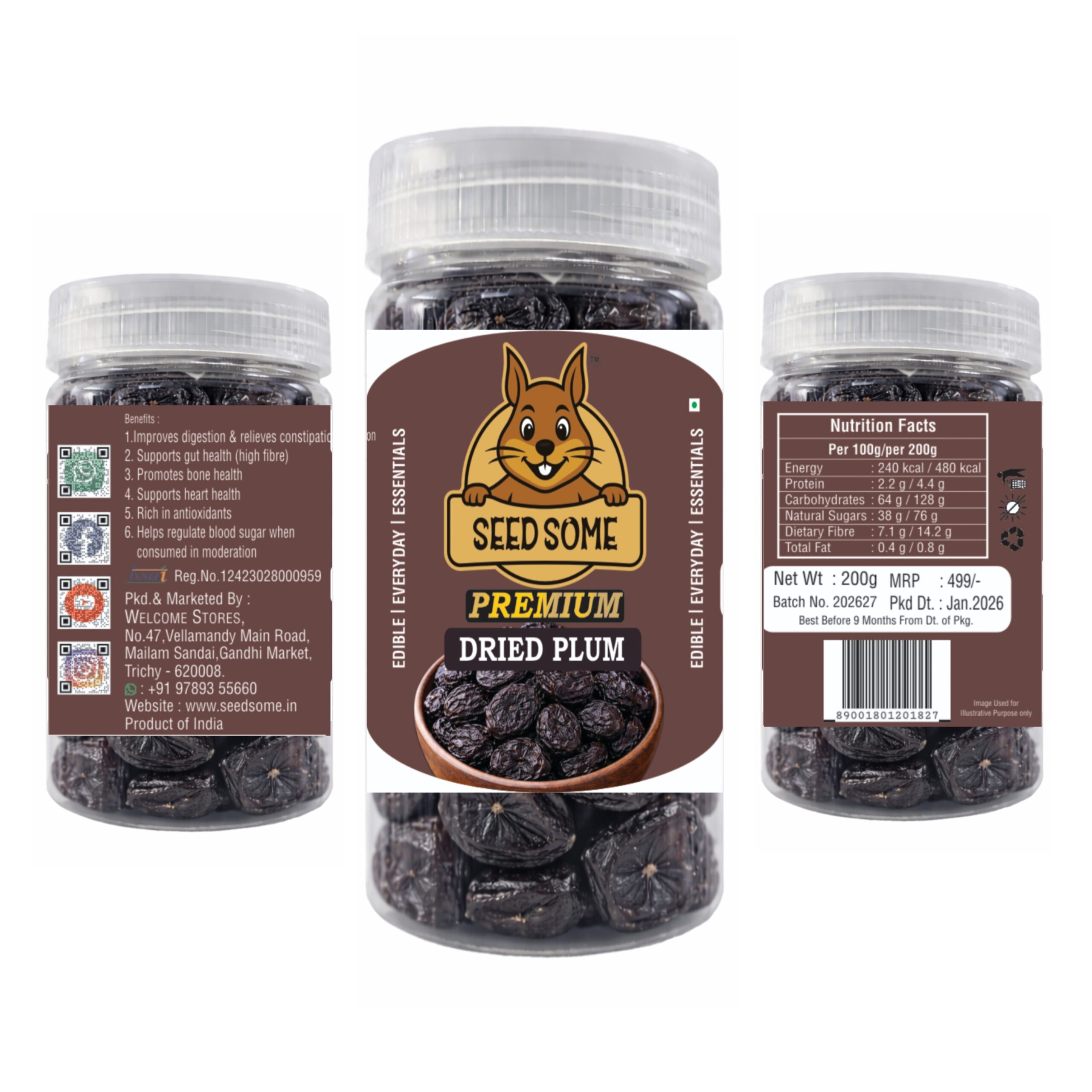 Enjoy the rich taste and natural goodness of Seedsome Dried Plums 200g, also known as premium prunes, carefully selected and gently dried to retain flavor and nutrition. These naturally sweet dried plums are rich in dietary fiber, antioxidants, vitamins, and essential minerals that help support digestion, gut health, and overall wellness. Widely known for promoting digestive regularity, dried plums are a smart choice for daily health support. Their soft texture and delicious sweetness make them ideal for healthy snacking, baking, desserts, cereals, smoothies, salads, and traditional recipes. Seedsome Dried Plums are hygienically packed to ensure freshness and quality, with no artificial colors, preservatives, or harmful additives. Suitable for all age groups, Seedsome Dried Plums offer a convenient and tasty way to enjoy nutritious dry fruits as part of a balanced and healthy lifestyle.