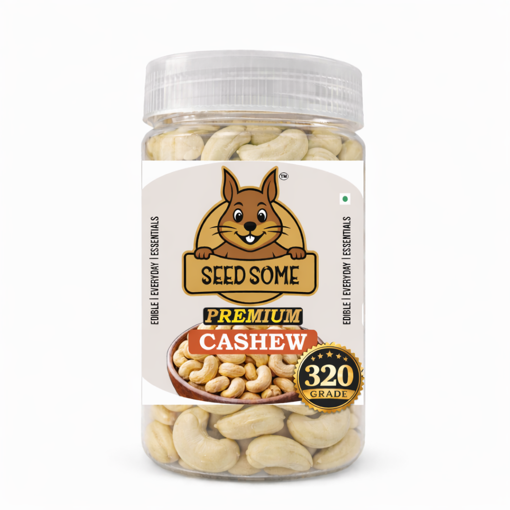 Enjoy the rich taste and superior quality of SEEDSOME Whole Cashews 320 Grade, carefully selected for their uniform size, premium texture, and irresistible crunch. These premium edible cashew nuts are expertly roasted to perfection, delivering a deliciously nutty flavor with every bite. The 320 grade cashews are known for their whole shape, creamy taste, and excellent crunch, making them ideal for everyday snacking, cooking, and gifting.
