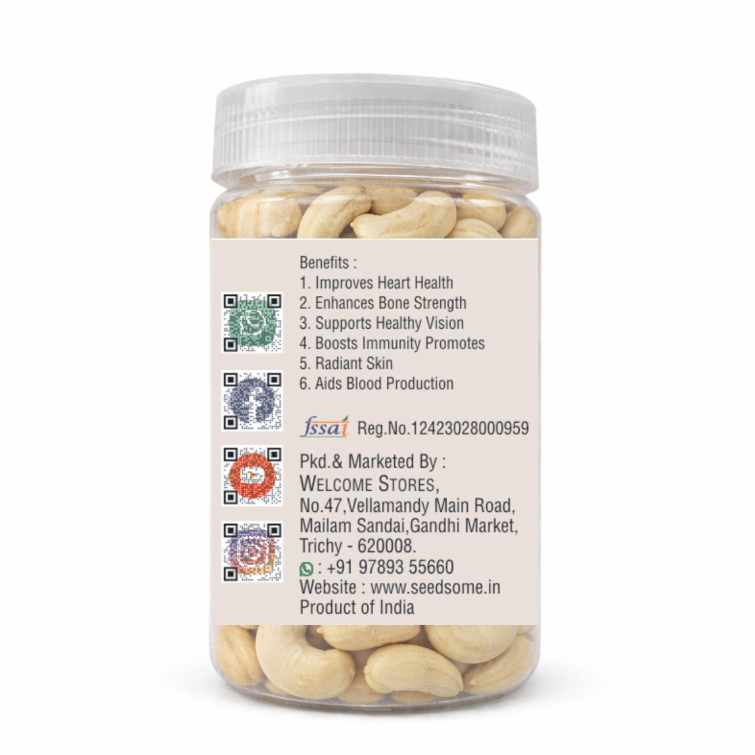 Perfect for health-conscious consumers, SEEDSOME roasted cashews are free from artificial flavors and preservatives. Choose SEEDSOME for premium quality, great taste, and trusted nutrition in every handful.